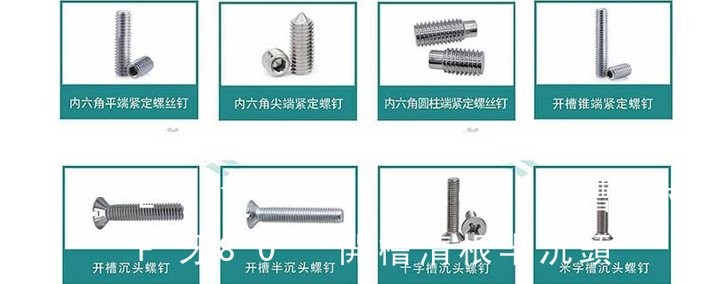 6.開槽盤頭螺釘 GB67-85(ISO1580-1983) 材料:鋼 機械性能:4.8 ;不銹鋼 機械性能:A2-50 7.開槽沉頭螺釘 GB68-85(ISO2009-1983) 材料:鋼 機械性能:4.8 ;不銹鋼 機械性能:A2-50 8.GB69-85(ISO2010 (鐵板牙自攻螺絲) B-2: Plastic Tapping Screw. (塑膠用,自攻螺絲) C: Wooden Screw : 木工螺絲 D: Drywall Screw :水泥墻螺絲 E: Self Drilling Screws鉆尾螺絲(不銹鋼鉆尾螺絲,復合材料鉆尾螺絲) F:膨脹螺絲,四片膨脹螺絲又